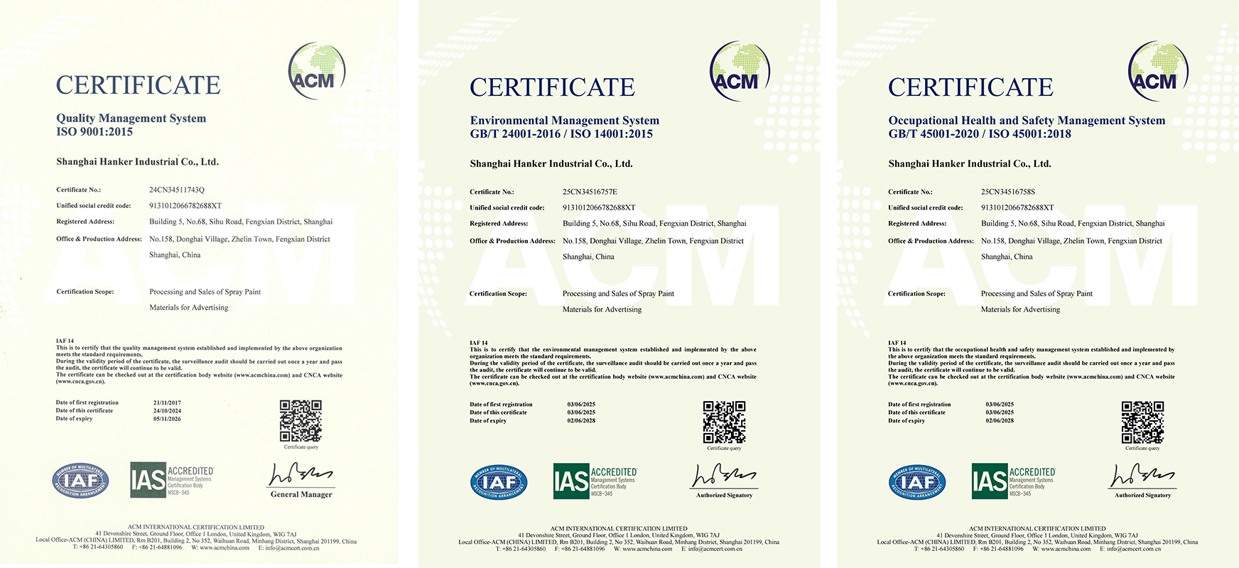Son zamanlarda, Shanghai Hanker Industrial Co., Ltd. ("Hanker" olarak adlandırılır) ISO 9001: 2015 Kalite Yönetim Sistemi Sertifikası, ISO 14001 Çevre Yönetim Sistemi Sertifikası ve ISO 45001 İş Sağlığı ve Güvenlik Yönetim Sistemi Sertifikası ACM International Sertifikası Limited'in denetimi yoluyla başarıyla elde etti. Bu başarı, şirketin kalite kontrol, çevre koruma ve çalışan güvenliği konusunda uluslararası standartları tamamen karşıladığını göstermektedir. Bu üç sistem sertifikasının edinilmesi, Hanker'ın standart yönetime olan uzun vadeli bağlılığının sonucudur. Üretim süreçlerini optimize ederek, çevresel risk önleme ve kontrol mekanizmaları oluşturarak ve iş sağlığı ve güvenlik eğitim sistemlerini iyileştirerek, şirket hammadde tedarikinden bitmiş ürün sunumuna kadar tüm zincir üzerinde standart kontrol elde etmiştir. Gelecekte, bu sertifikaları bir temel olarak alan Hanker, teknolojik yenilikleri ve yönetim yükseltmesini daha da derinleştirecek, üniversiteler-üniversite-araştırma işbirliğini aktif olarak teşvik edecek, malzeme alanındaki en son uygulamaları keşfedecek ve sektörün yüksek kaliteli gelişimine katkıda bulunacak. .